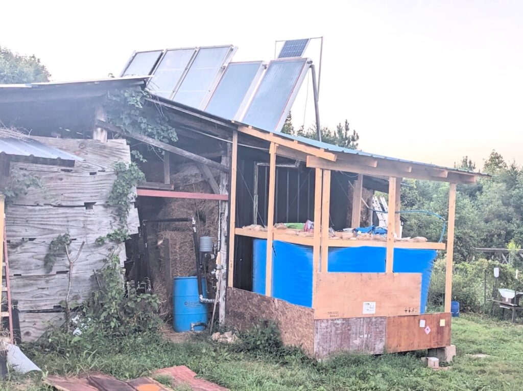 In sunny, tropical climates, temperatures in the happy 90-100 degree range can be maintained passively, by placing a black digester in the sun. In our much cooler and cloudier climate, supplemental heat and insulation are a must. At LEF we use an active solar thermal heat loop that connects 5 flat plate collectors (115 sq ft total) to a heat exchanger inside the tank. It is very similar to our hot water system. For insulation, we have two layers of strawbales and 3’ of blown cellulose over the top.