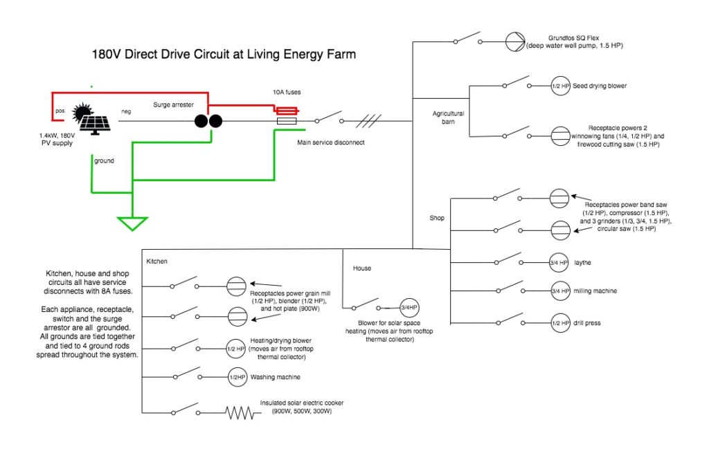 The most developed direct drive circuit that we know if is at Living Energy Farm. Below is a wiring diagram that shows all the loads on the circuit.